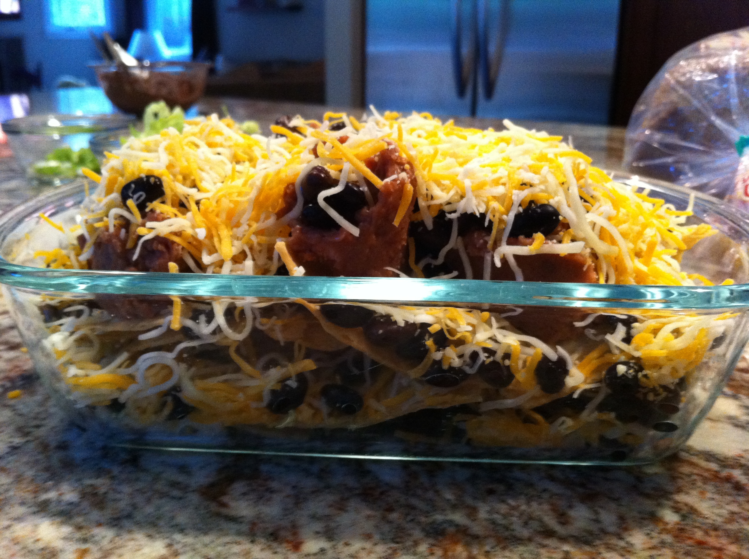 First, I assembled the chips, beans (both kinds) and cheese in an oven-safe dish. Layer chips, beans, cheese. Repeat. Repeat again. It’s so important to integrate the beans and cheese throughout the chips so every bite contains tasty goodness. There is nothing worse than a sad, dry, empty chip.