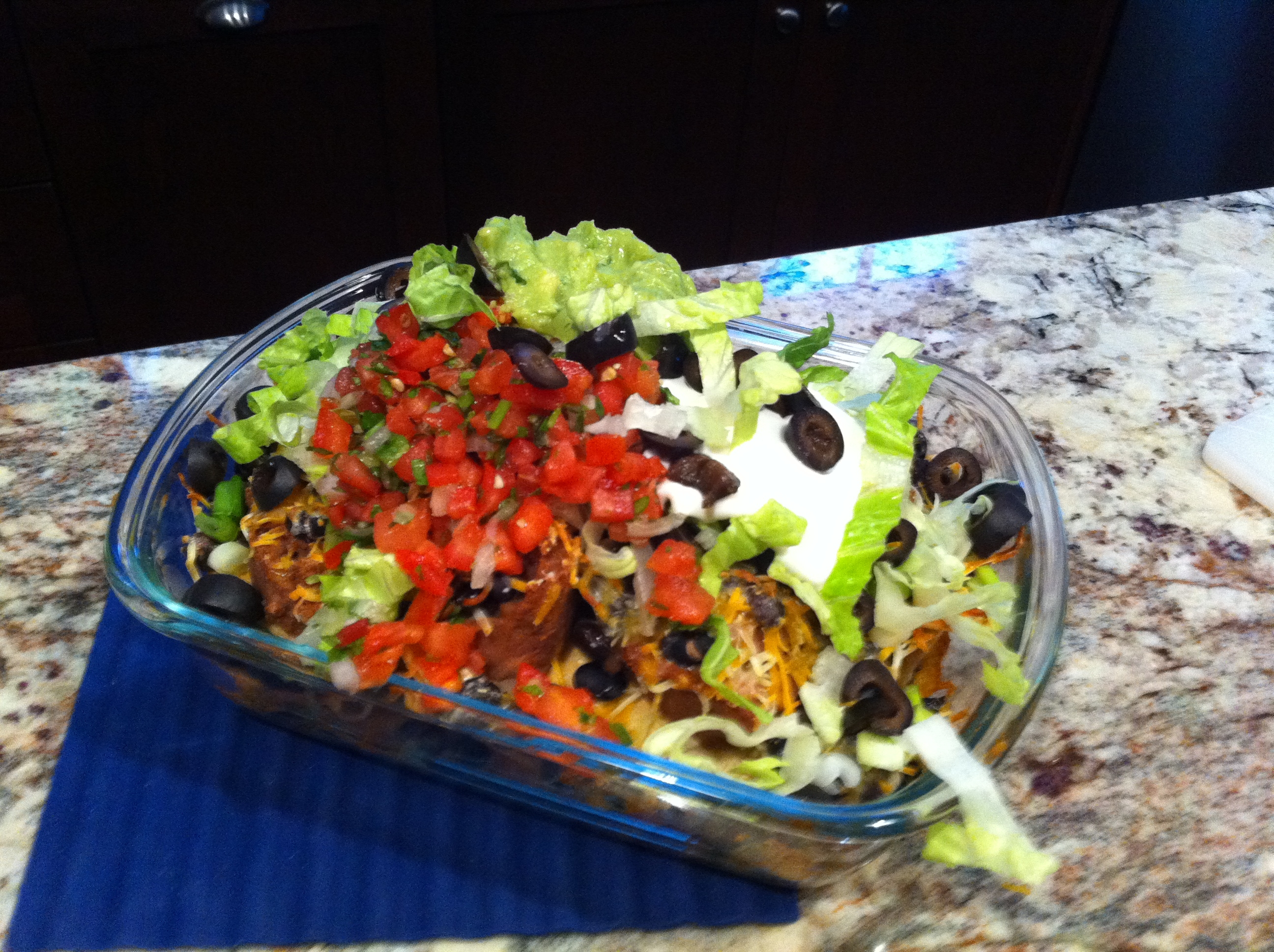 A couple of additional learnings – somehow I used cheese that wasn’t full fat and that was all kinds of wrong. You need full fat, stringy, gooey, greasy cheese for nacho perfection. Believe you me, I won’t make that mistake again. In addition, the top layer of refried pinto beans got a little dry while in the oven. The piles underneath were more moist and the proper consistency but the top layer had problems. Perhaps they need to be in the bottom layers only? Or, they need to be covered in that gooey cheese to stay moist. I’ll be making some modifications in this area on my next attempt.