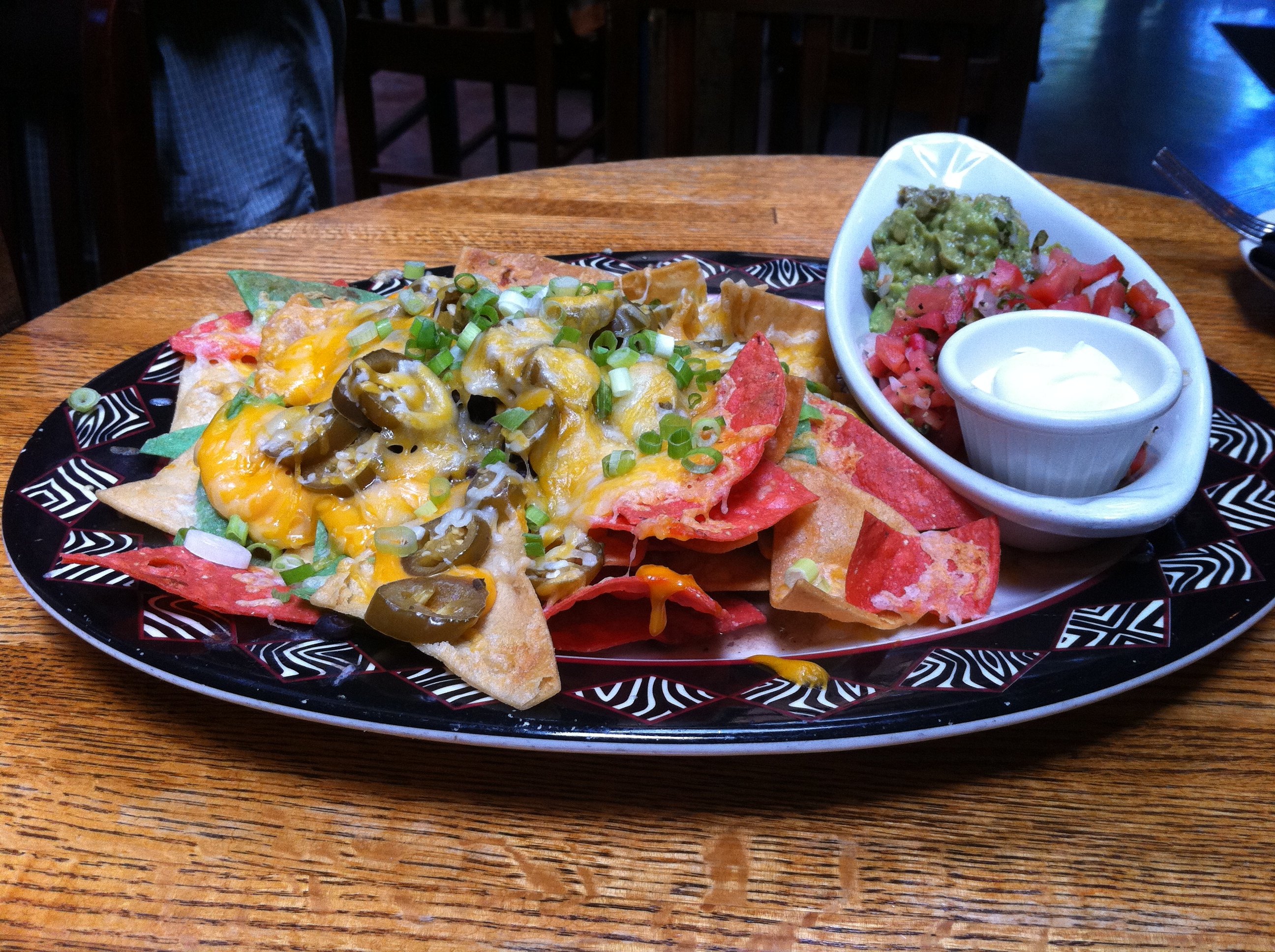 Some other details: Chips were tri-colored. My tastebud jury is still out on tri-colored chips but I liked them enough in this case. There was plenty of melted shredded cheese wrapping the jalepenos and hidden black beans in cheesy goodness for every bite. I’m a huge fan of green onions on anything so their presence alone instantly raised my opinion of these nachos a notch. Now, one thing I have to mention that was less than ideal – in addition to the shredded melted cheese, there was some (gasp!) liquid cheese. It was spicy and I’m partially ashamed to admit that I liked the flavor it added. but the texture I could have done without. My only other complaint would be not enough chips. My nacho assessing wingman and I were done with all the chips long before we had consumed all of the wonderful toppings. But here’s a tip: You can ask for extra chips and they will happily bring them to you.
